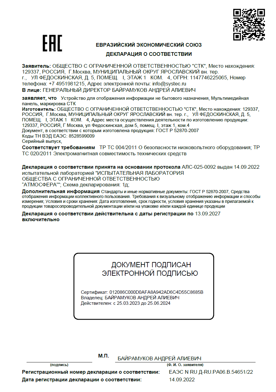 Декларация о соответствии мультимедийная панель СТК